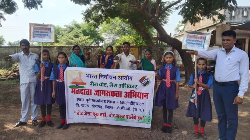 खैरागढ़ 00 कलेक्टर गोपाल वर्मा के दिशा निर्देशन व बीईओ खैरागढ़ नीलिमा सिंह के मार्गदर्शन शासकीय पूर्व माध्यमिक शाला अमलीडीह कला के छात्र-छात्राओं ने मंगलवार को मतदाता जागरूकता को लेकर रैली निकाली। रैली विद्यालय परिसर से निकाली गई जो मेन रोड, मन्दिर रोड,टंकी गली आदि मुहल्ला होते हुए विद्यालय परिसर पहुंची। इस दौरान छात्र-छात्राएं वोट देने की अपील की तख्तियां लेकर चल रहे थे। जिसमें पहले मतदान फिर जलपान, चाहे नर हो या नारी मतदान सब की जिम्मेवारी, वोट डालने जाना है अपना फर्ज निभाना है, सत्य और ईमान से सरकार बनाएंगे मतदान से, अब जागो प्यारे, मतदाता वोट हमारा अधिकार, कभी ना करें इसका बहिष्कार जैसी स्लोगन लिखा था। प्रधान पाठक रुपेश कुमार देवांगन ने कहा कि भारत एक मजबूत लोकतांत्रिक देश है। भारत के नागरिकों को शत प्रतिशत मतदान देकर एक सशक्त सरकार का निर्माण करने में अहम भूमिका निभाना चाहिए। हर नागरिक जिनका उम्र 18 वर्ष या उससे अधिक हो गया हो वे सभी 7 नवंबर 2023 दिन को अपना मतदान जरूर करें। मतदाता जागरूकता को लेकर रैली शिक्षक कृष्ण प्रसाद वर्मा सहित छात्र-छात्राये शामिल थे ।