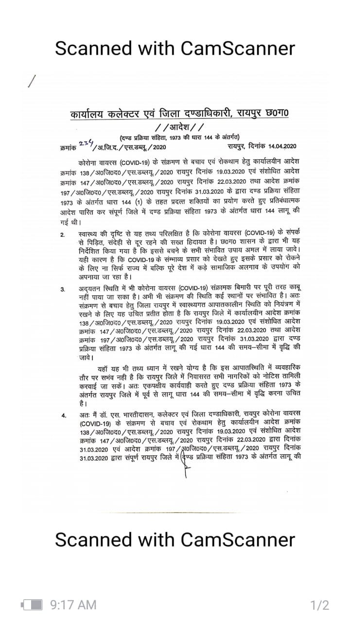 रायपुर, मुख्यमंत्री श्री भूपेश बघेल के निर्देश पर कोरोना वायरस के संक्रमण से लोगों की सुरक्षा के लिए राज्य के जिलों में धारा-144 की अवधि 3 मई तक बढ़ाई जा रही है। रायपुर कलेक्टर एवं जिला दण्डाधिकारी श्री भारतीदासन द्वारा आज रायपुर जिले में 3 मई 2020 तक या आगामी आदेश तक धारा 144 प्रभावशील रहने का आदेश पारित किया है। आदेश के अनुसार धारा 144 का उल्लंघन करने वालों पर नियमानुसार सख्त कार्यवाही की जाएगी। इसी तरह प्रदेश के अन्य जिलों में भी कलेक्टर एवं जिला दण्डाधिकारियों द्वारा धारा-144 की अवधि बढ़ाने के आदेश जारी करने की कार्यवाही की जा रही है।