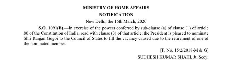 अधिसूचना में कहा गया है: "भारत के संविधान के उपखंड (1) के उपखंड (1) अनुच्छेद 80 द्वारा प्रदत्त शक्तियों के प्रयोग में, उस लेख के खंड (3) के साथ पढ़ें, राष्ट्रपति श्री रंजीत गोगोई को नामित करने की कृपा करते हैं  मनोनीत सदस्य में से किसी एक के सेवानिवृत्त होने के कारण रिक्त स्थान को भरने के लिए राज्यों की परिषद। ”