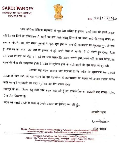 आपकी यह बहन आपको याद दिलाती है, कि प्रदेश के मुख्यमंत्री का राजधर्म जनता से किए वादे को पूरा करना है, इस रक्षाबंधन में छत्तीसगढ़ की बहनों को उपहारस्वरूप कांग्रेस पार्टी का पूर्ण शराबबंदी का वादा पूरा कर यह भेंट अवश्य देंगे,रक्षासूत्र के साथ तिलक हेतु रोली और अक्षत भेज रही हूँ जो आपको आपका राजधर्म याद दिलाता रहेगा, ऐसा मेरा विश्वास है।