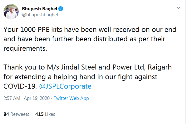 कोरोना संक्रमण की रोकथाम और बचाव के लिए मेसर्स जिन्दल स्टील एण्ड पावर लिमिटेड रायगढ़ द्वारा 1000 पीपीई किट, मेसर्स भारत एल्युमिनियम कम्पनी लिमिटेड बाल्को द्वारा 1000 पीपीई किट एवं 500 एम.एल के 500 बाटल सेनेटाइजर तथा 5000 सर्जिकल मास्क उपलब्ध कराए गए हैं। मुख्यमंत्री भूपेश बघेल और उद्योग मंत्री कवासी लखमा ने इन औद्योगिक संस्थानों को इस सहायता के लिए धन्यवाद दिया है। उद्योग मंत्री श्री कवासी लखमा ने इस सामग्री में से 300 पीपीई किट जिला बस्तर और 200 पीपीई किट जिला प्रशासन सुकमा को सौंपा है।