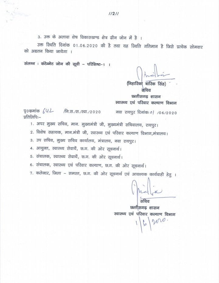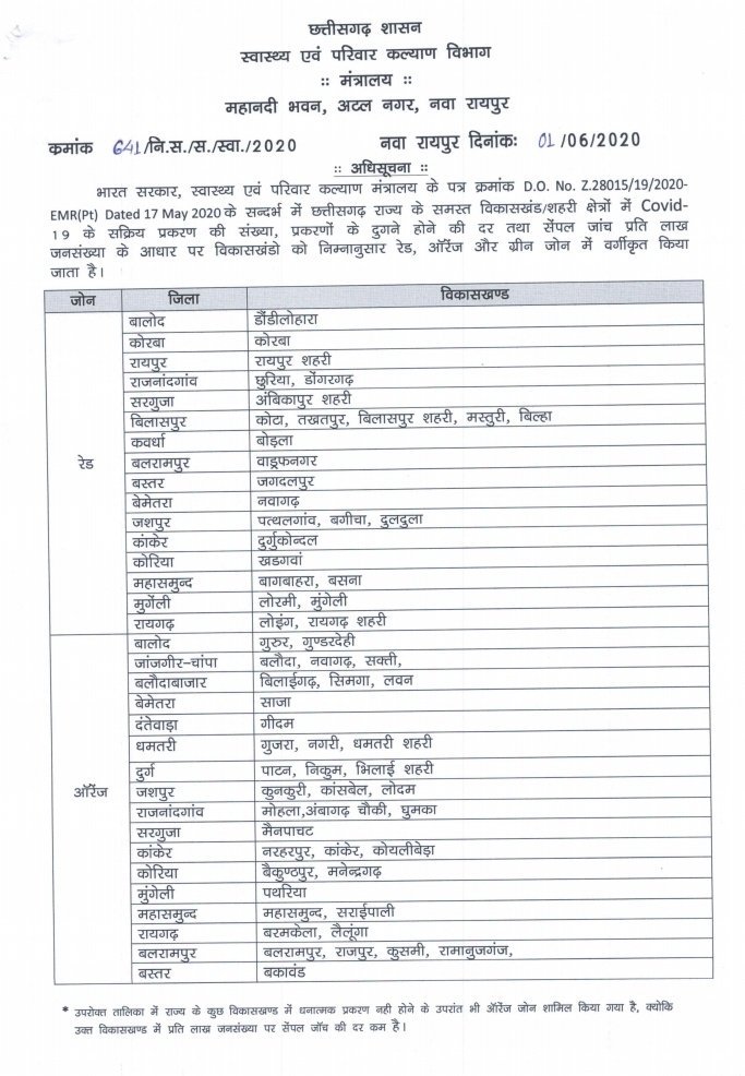 रायपुर : छत्तीसगढ़ के स्वास्थ्य विभाग ने प्रदेश के हर जिले को जून में डिवाइड कर दिया है और जिले के साथ-साथ उन विकास खंडों की लिस्ट तैयार की है जो रेड ऑरेंज और ग्रीन जोन में कोरोना संक्रमण का खतरा देखते हुए हर विकासखंड को संबंधित जोन में रखा गया है। प्रदेश के 16 जिलों के 27 विकास खंडों को रेड जोन में रखा गया ।
