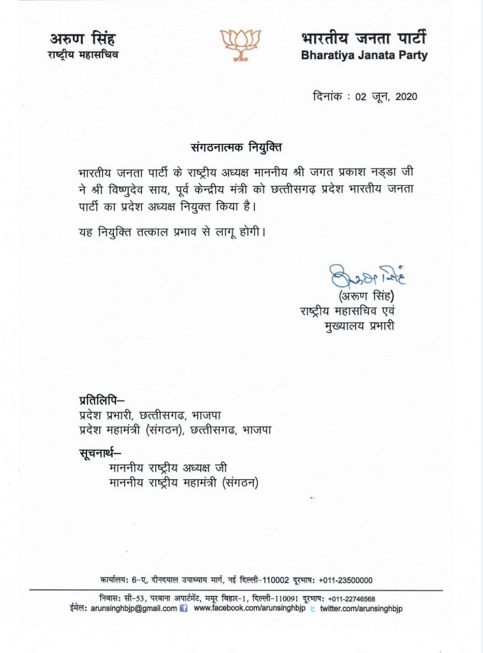 प्रदेश में बीजेपी प्रदेश अध्यक्ष को लेकर तमाम अटकलों के बीच आखिरकार बीजेपी नेता एवं पूर्व केंद्रीय मंत्री विष्णुदेव साय के हाथ में प्रदेश संगठन की कमान थमाई गई। भारतीय जनता पार्टी के राष्ट्रीय अध्यक्ष जेपी नड्डा ने उन्हें छत्तीसगढ़ प्रदेश अध्यक्ष के तौर पर नियुक्त किया है।