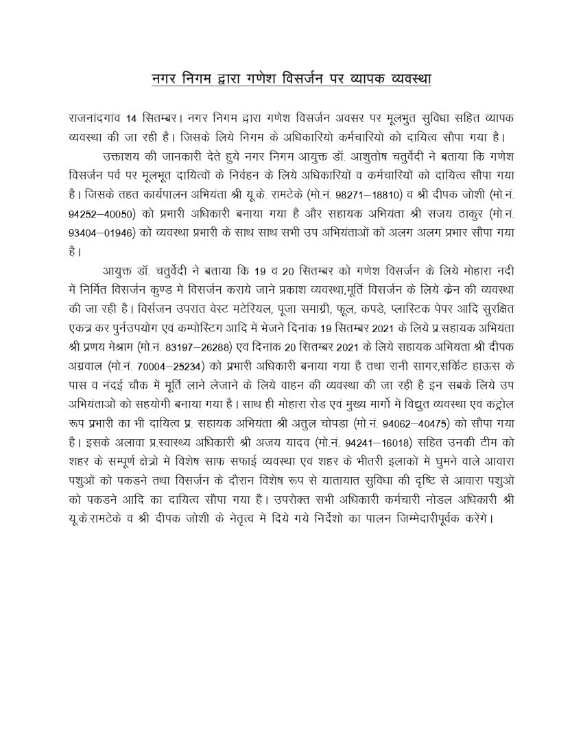 उक्ताशय की जानकारी देते हुये नगर निगम आयुक्त डॉ. आशुतोष चतुर्वेदी ने बताया कि गणेश विसर्जन पर्व पर मूलभूत दायित्वों के निर्वहन के लिये अधिकारियों व कर्मचारियों को दायित्व सौपा गया है। जिसके तहत कार्यपालन अभियंता श्री यू.के. रामटेके (मो.नं. 98271-18810) व श्री दीपक जोशी (मो.नं. 94252-40050) को प्रभारी अधिकारी बनाया गया है और सहायक अभियंता श्री संजय ठाकुर (मो.नं. 93404-01946) को व्यवस्था प्रभारी के साथ साथ सभी उप अभियंताओं को अलग अलग प्रभार सौपा गया है।
