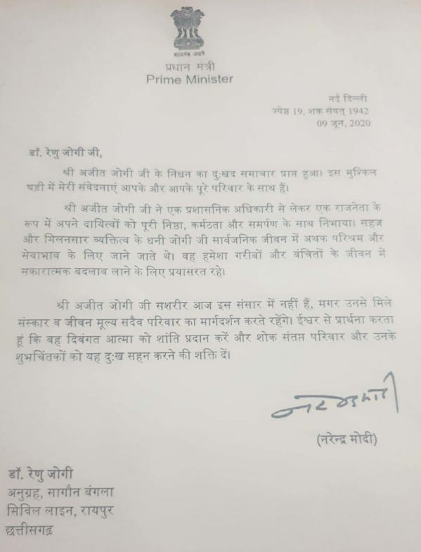 रायपुर : प्रधानमंत्री नरेंद्र मोदी ने दिवंगत नेता और छत्तीसगढ़ के प्रथम मुख्यमंत्री अजीत जोगी की पत्नी डॉक्टर रेणु जोगी को एक पत्र लिखा है यह पत्र 9 जून को जारी किया गया है।