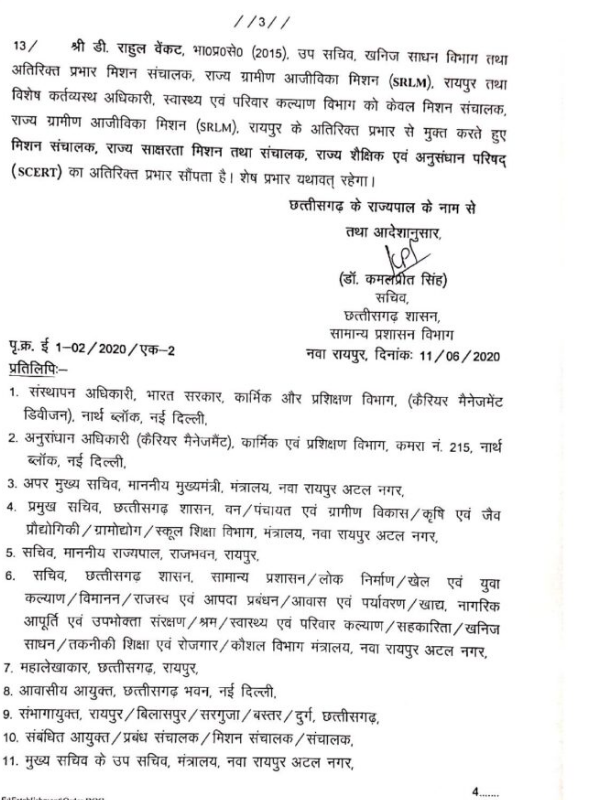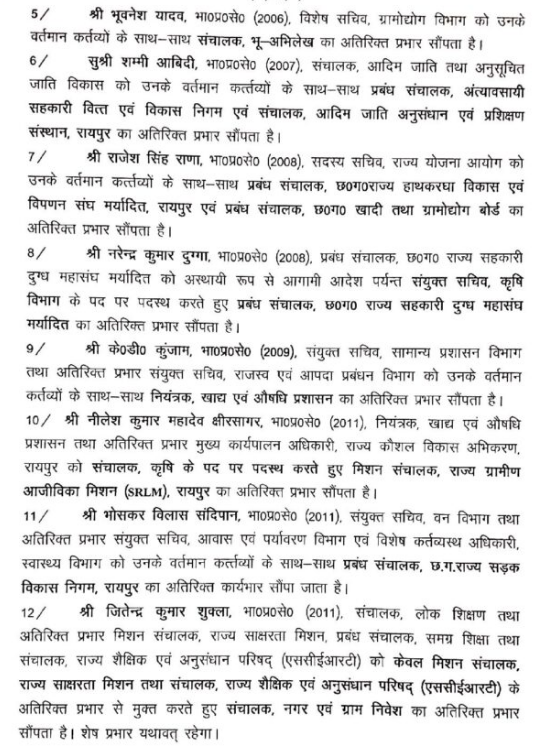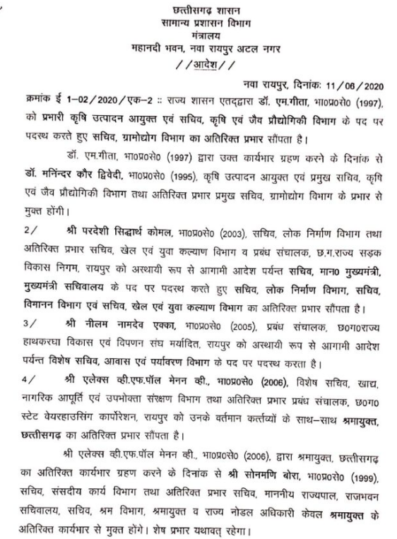 रायपुर।राज्य शासन ने गुरुवार को आईएएस अफसरों की नवीन पदस्थापना आदेश जारी किए हैं।डाॅ.एम गीता- कृषि उत्पादन आयुक्त, सचिव, कृषि एवं जैव प्रौद्योगिकी, ग्रामोद्योग आयुक्त और सचिव कृषि और जेव प्रौद्योगिक विभाग के पद पर पदस्थ करते हुए सचिव ग्रामोद्योग विभाग का अतिरिक्त प्रभार सौंपा गया है।परदेसी सिद्धार्थ कोमल- सचिव,मुख्यमंत्री, पीडब्ल्यूडी, विमानन, खेल एवं युवा कल्याण का अतिरिक्त प्रभार निगम को आगामी आदेश तक सचिव मुख्यमंत्री सचिवालय के पद पर पदस्थ किया गया है।नीलम नामदेव एक्का- विशेष सचिव, आवास एवं पर्यावरण,भुवनेश यादव को संचालक भू अभिलेख, केडी कुंजाम नियंत्रक खाद्य और औषधि प्रशासन का अतिरिक्त प्रभार दिया गया है।