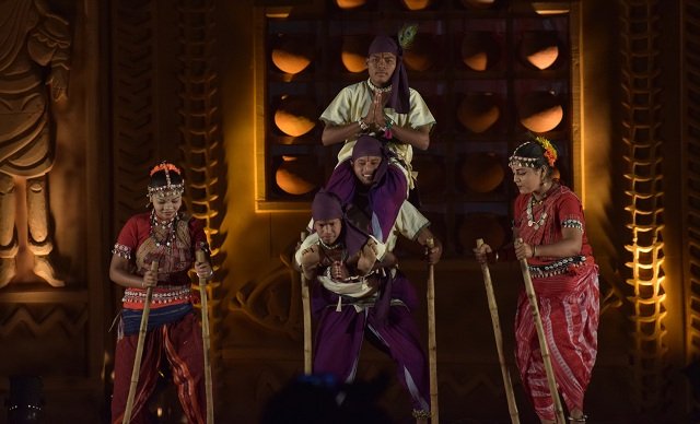 नियाव@ खैराागढ़. गोपी-कृष्ण भेष में आदिरंग के मंच पर उतरे ओडीसा के कलाकारों ने जब छाऊ डांस से दर्शकों को रोमांचित किया। उनकी कलाबाजियां और चेहरों के भाव देख दर्शक दीर्घा में खूब वाहवाही हुई। मध्यप्रदेश की धुलिया जनजाति के तीज-त्योहारों में बजने वाले गुदुम बाजा की गूंज पूरी संगीत नगरी ने सुनी। फिर चिर-परिचित अंदाज में प्रस्तुति देने वाले पंथी और कर्मा के कलाकारों को दर्शकों ने सहर्ष स्वीकारा। मांदर की थाप पर तालियां बंटोरी। गुजरात की शादियों में धूम मचाने वाले गागर नृत्य ने मन मोह लिया। लद्दाख में जाब यानी पैर और रो मतलब गर्म करना। इस तरह जाबरो की प्रस्तुति ने पूरे माहौल में गर्मी ला दी। एक के बाद एक विभिन्न राज्यों की प्रस्तुति ने आखिरी दिन भी दर्शकों को बांधे रखा।