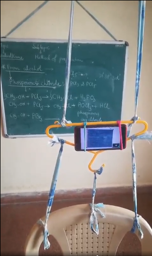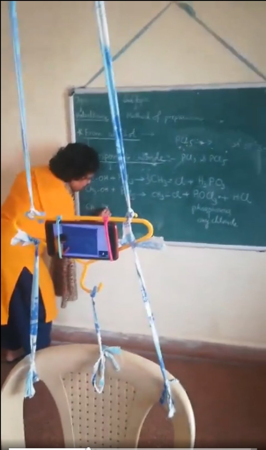 वैसे तो भारतीय महिलाएं हैरतअंगेज जुगाड़ के लिए कभी पीछे नहीं रही है और यह जुगाड़ देसी जुगाड़ है सबसे पहले पुराना कपड़ा जिसे रस्सी बनाया गया, जिससे हैंगर को बांध दिया हैंगर के निचले सिरे से तीन और रस्सी मानकर उसे कुर्सी से बांध दिया गया ताकि हैंगर इधर उधर ना हीले इसके बाद उस हैंगर में रबड़ के जरिए मोबाइल को फंसा दिया और इसे इस एंगल में फिट किया जिससे सामने का ग्रीन बोर्ड और पढ़ाती हुई मैडम पूरे स्क्रीन में नजर आए।