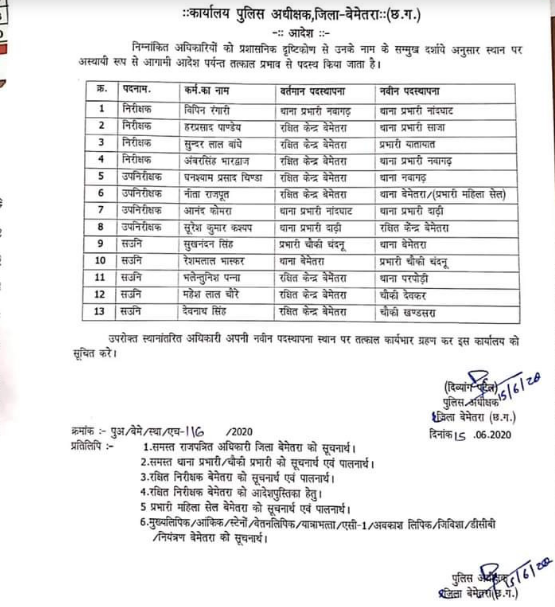 बेमेतरा : प्रदेश के बेमेतरा जिला पुलिस अधीक्षक कार्यालय से 13 पुलिसकर्मियों के तबादले की सूची जारी की गई। इसमें 4 थाना प्रभारी सहित 13 पुलिसकर्मि शामिल हैं।