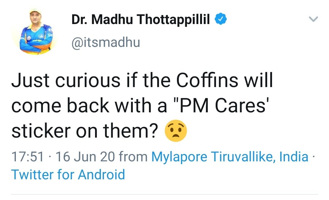 ”चेन्नई सुपर किंग्स की टीम मैनेजमेंट को मधु ठोत्तपिलील के ट्वीट के बारे में कुछ पता नहीं था. ये उनके निजी ट्विटर हैंडल से पोस्ट किया गया था. उनको उनके पद से सस्पेंड किया गया है. सीएसके उनके पर खेद व्यक्त करता है, ये ट्वीट अपमानजनक था.”