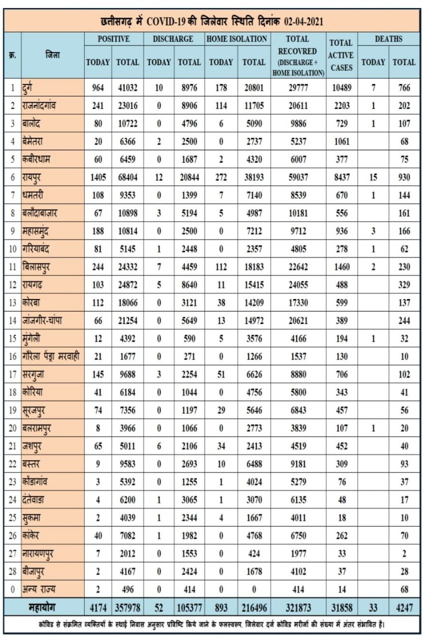 वैसे तो प्रदेश में दो दिनों की तुलना में शुक्रवार को मरीज कम आए, लेकिन मौत का आंकड़ा डराने वाला है। कुल 33 लोगों की जान कोरोना से गई है। रायपुर में कहर बढ़ता जा रहा है। राजधानी में शुक्रवार को सर्वाधिक 1405 मरीज मिले, जबकि दुर्ग में 964 केस आए। रायपुर में सर्वाधिक 15 लोगां की मौत हुई, जो अब तक का सबसे बड़ा आंकड़ा है। वहीं दुर्ग में 7, महासमुंद में 3, बिलासपुर में 2 मौत हुई है। राजनांदगांव, बालोद, धमतरी, गरियाबंद, मुंगेली, बलरामपुर में 1-1 मौत हुई है।